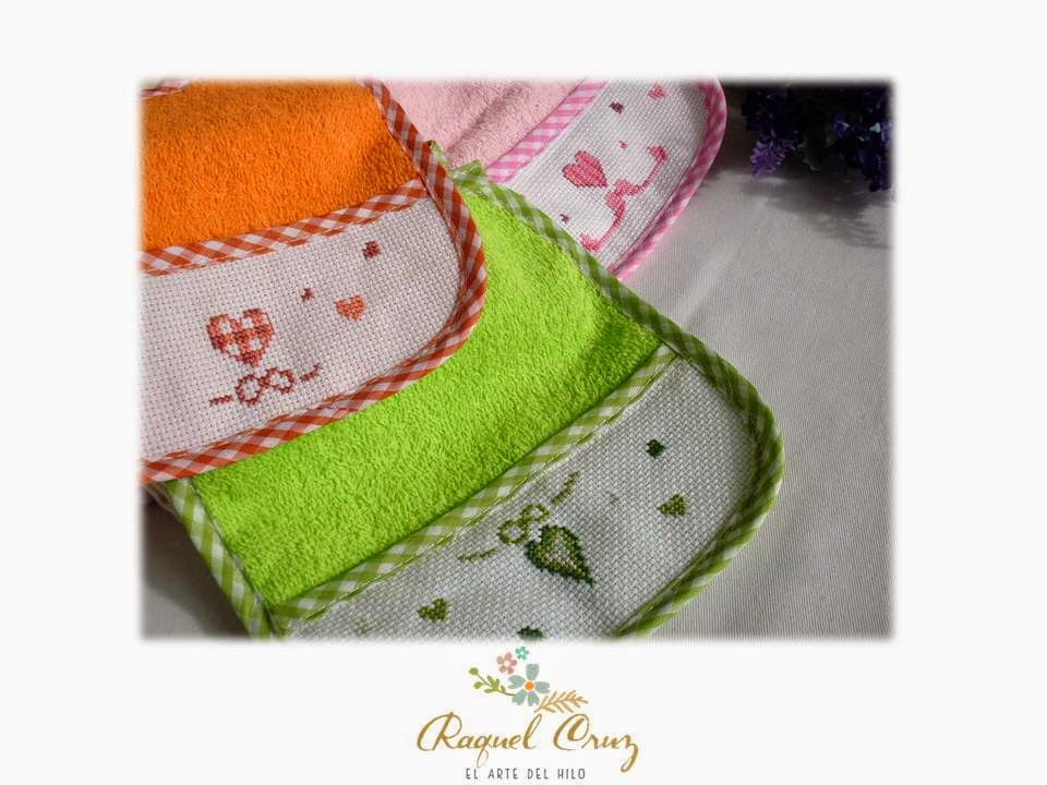 En primer lugar muestro tres baberos con colores alegres y bordados con los mismos colores con que están confecionados.