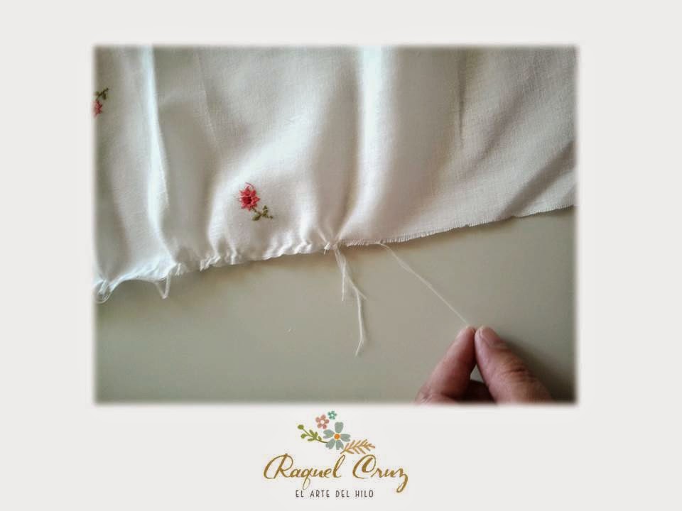 12 Ahora pasamos a la parte baja de la enagua.En mi caso he decidido ponerle una puntilla en el borde y unos pasacintas.