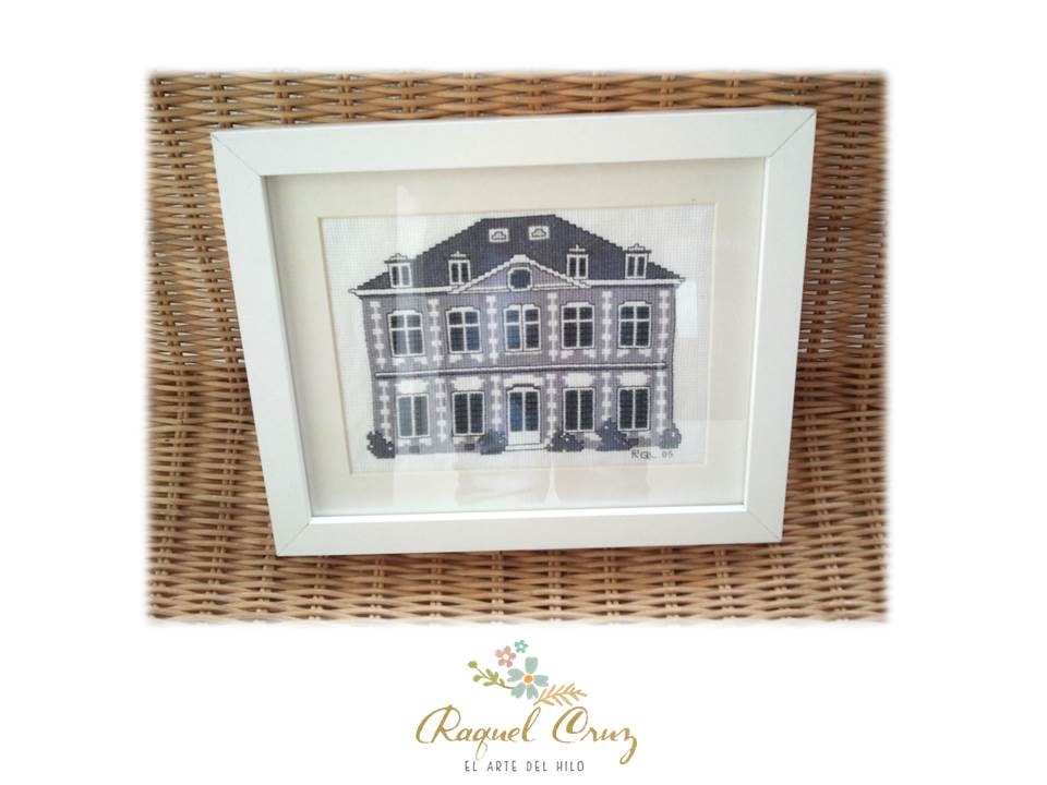 Bordada sobre tela de panamá blanca y con colores de la gama desde el blanco al negro de la casa de hilos