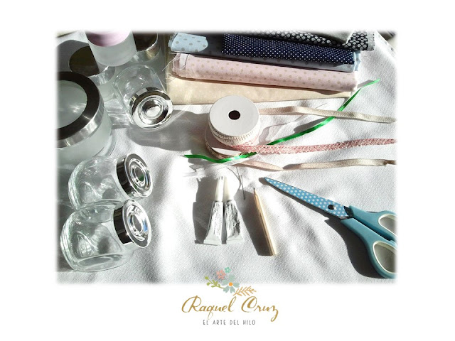 Con estos materiales que he usado... algunos son botes de cremas gastados, otros son de botes de Ikea ...Pero como podéis ver esta manualidad se puede aplicar a cualquier bote que tengáis por casa.