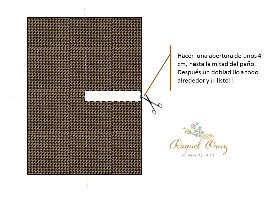 Es súper sencillo, sólo hay que hacerle un dobladillo a un rectángulo de tela con la medida que cada uno quiera, una abertura en el centro hasta la mitad del paño y listo.