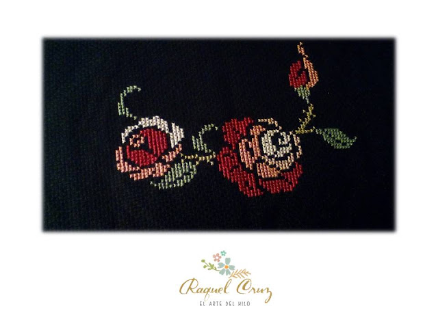 Pero en esta ocasión muestro unos motivos bordados de rosas a punto de cruz, sobre tela panamá en color negro.